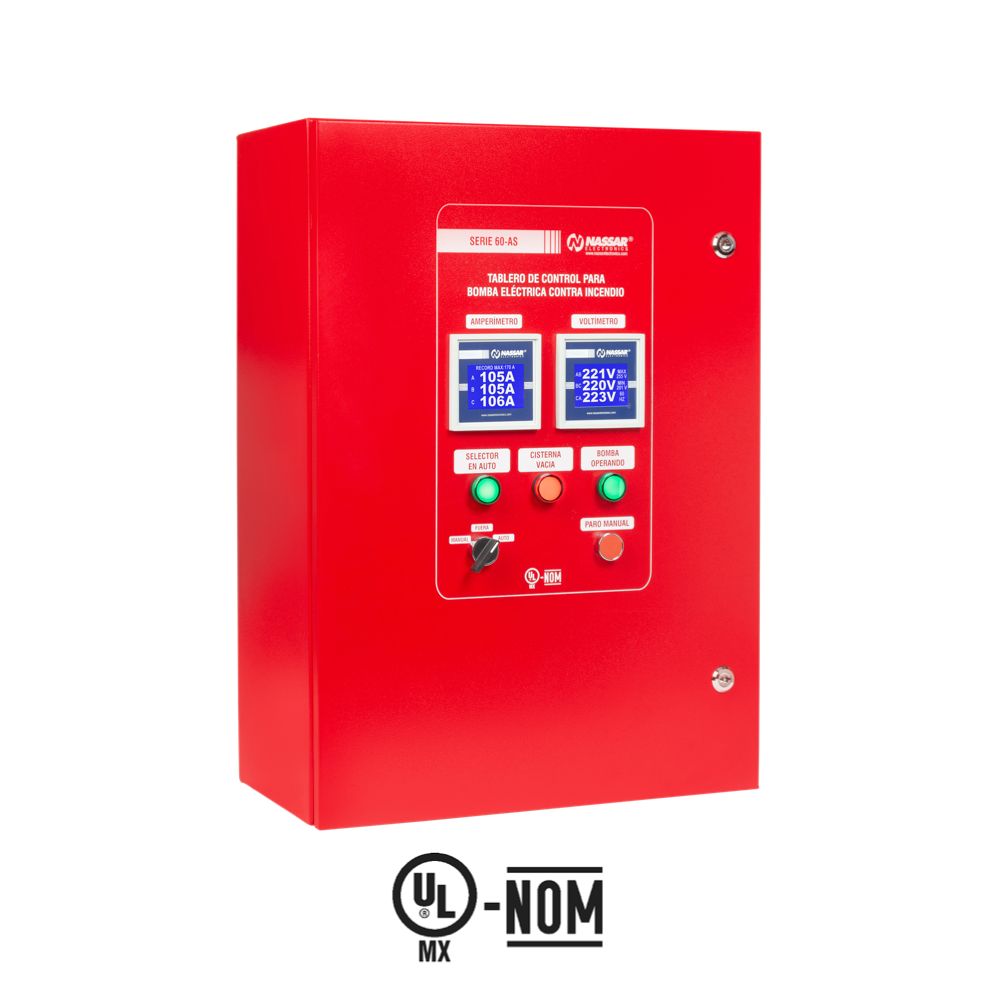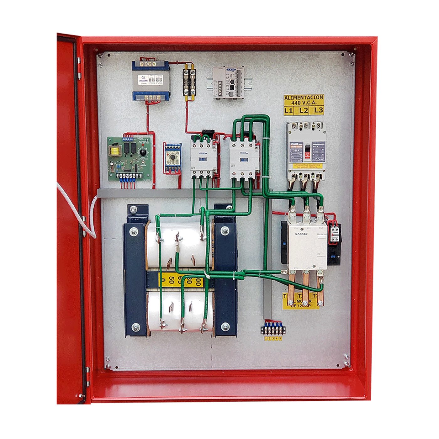 Tablero contra incendio con arrancador a voltaje reducido que disminuye drásticamente la corriente de arranque, controla la operación automática de bombas contra incendio con motor eléctrico. Detecta el nivel de agua de la cisterna, tiene un retardo de paro ajustable y cuenta con pilotos indicadores de operación y bajo nivel de succión.