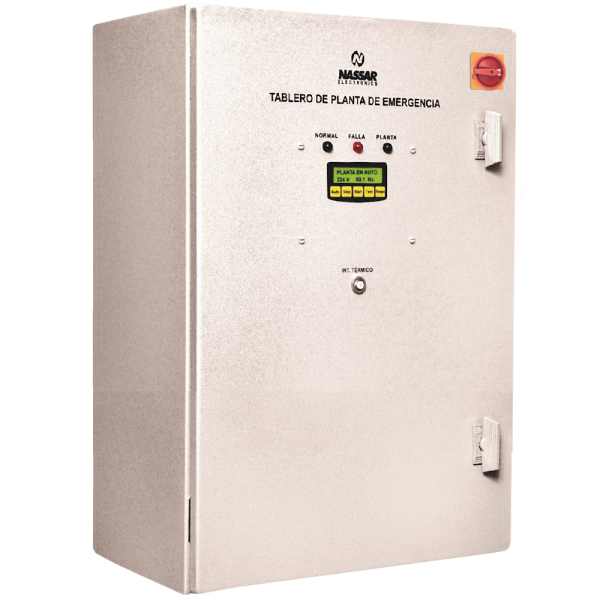 Control panel for an emergency plant operated by a gasoline or diesel engine. The panel automatically starts the plant when a failure in the normal supply voltage occurs, disconnects the normal supply, and connects the emergency plant.