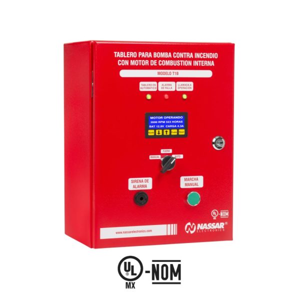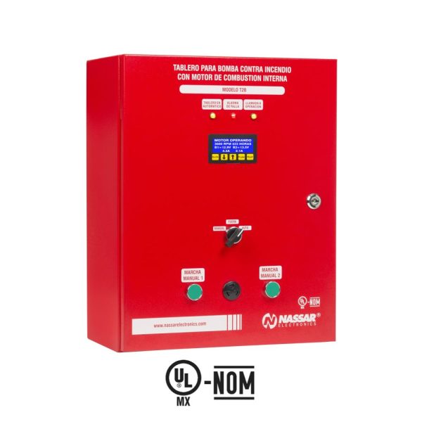 Fire panel for a single-battery internal combustion engine, controls the automatic operation of fire pumps powered by a single-battery internal combustion engine. Its LCD display shows battery voltage, charger current, tachometer, hour meter, operation, settings, and faults.