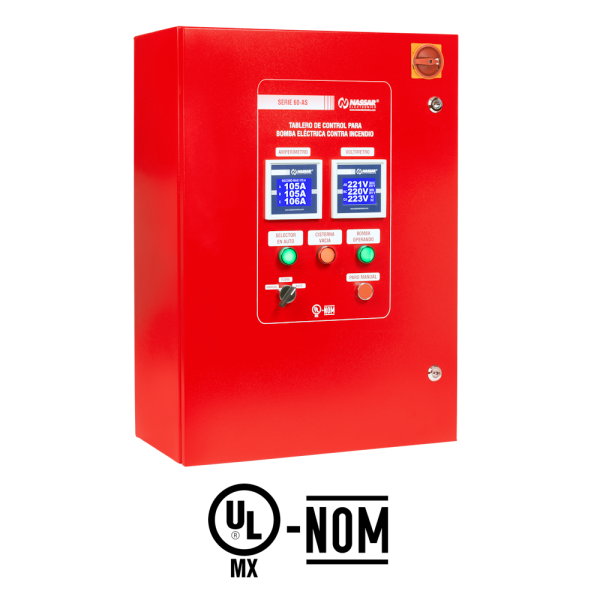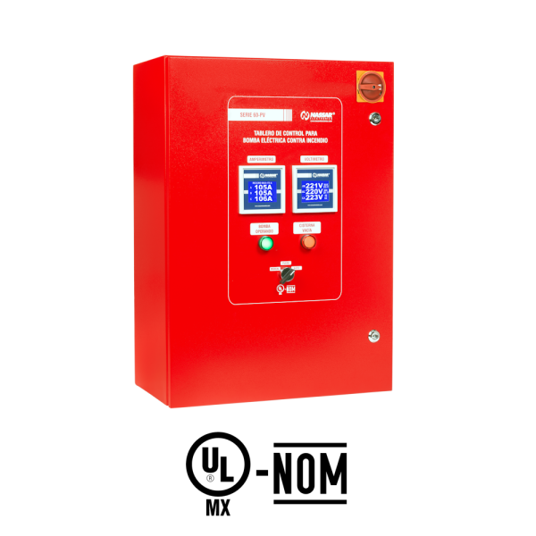 Fire panel with soft starter for an electric motor that drastically reduces the starting current, controls the automatic operation of fire pumps with an electric motor. It detects the water level in the cistern, has an adjustable stop delay, and features indicator lights for operation and low suction level.