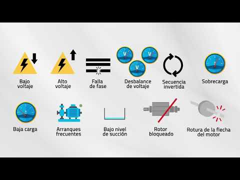 Protege motores y bombas contra bajo y alto voltaje, falla de fase, desbalance, rotación invertida, sobrecarga, baja carga, bajo nivel de succión, arranques frecuentes, y más. Su pantalla muestra voltajes, corrientes, fallas y ajustes.