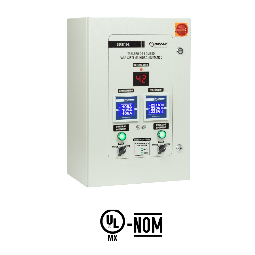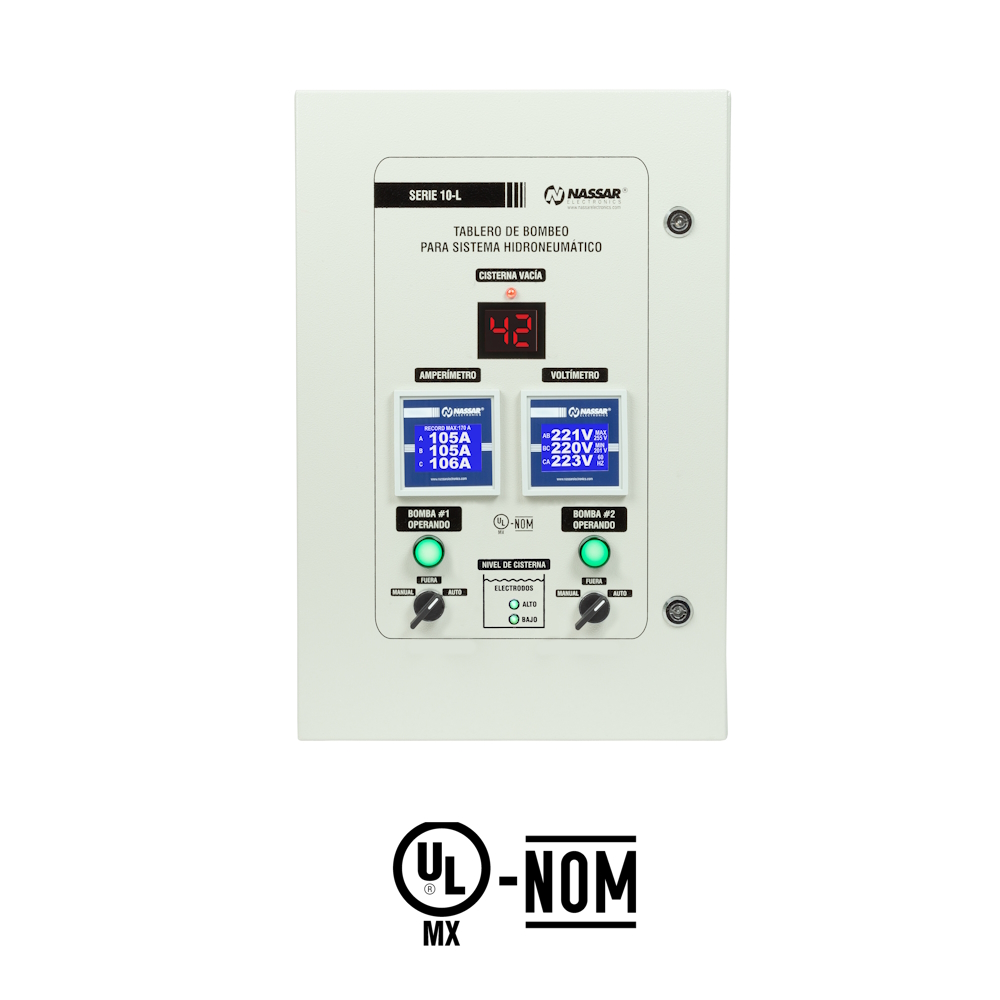 Los tableros incluyen contactores y protección contra corto circuito y sobrecarga, bajo nivel de agua en la cisterna, módulo de control de alternado y simultaneado, electrodos, pilotos y selectores. Se pueden ordenar con conexión a red para monitoreo con Modbus RTU vía RS-485 o Modbus TCP-IP vía Ethernet.